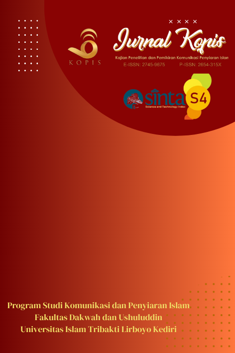 Jurnal Kopis: Kajian Penelitian dan Pemikiran Komunikasi Penyiaran IslamE-ISSN: 2745-9675 P-ISSN: 2654-315XJurnal Kopis: Kajian Penelitian dan Pemikiran Komunikasi Penyiaran Islam: Kopis journal has several research scopes both empirical and conceptual, including da’wah media, da’wah methods and strategis, audience analysis, da’wah and popular culture, da’wah and political communication, da’wah, community and social impact and da’wah and globalization.